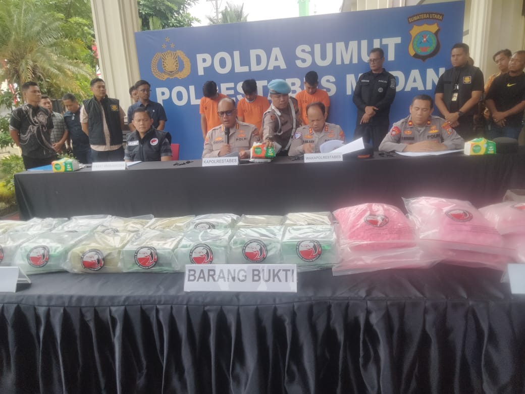 Dua tersangka, MAS (29 tahun), warga Jalan Titi Papan, Medan Petisah, dan MJN (24 tahun), warga Langsa, ditangkap dengan barang bukti 1 kg sabu.