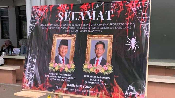 Papan itu bertuliskan ‘Selamat atas dilantiknya Jenderal Bengis Pelanggar HAM dan Profesor IPK 2,3 sebagai Presiden dan Wakil Presiden Republik Indonesia yang lahir dari rahim haram konstitusi’.