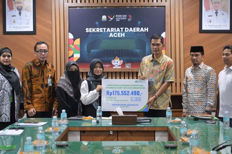 Santunan diserahkan Kepala BPJS Ketenagakerjaan Perwakilan Aceh Ferina Burhan, didampingi Kepala Kantor Wilayah BPJS Sumbagut I Nyoman Suarjaya, kepada Nayla Nazifa, anak pertama almarhum Abu Razak, di ruang rapat Sekda Aceh, Kamis, 8 Mei 2025.