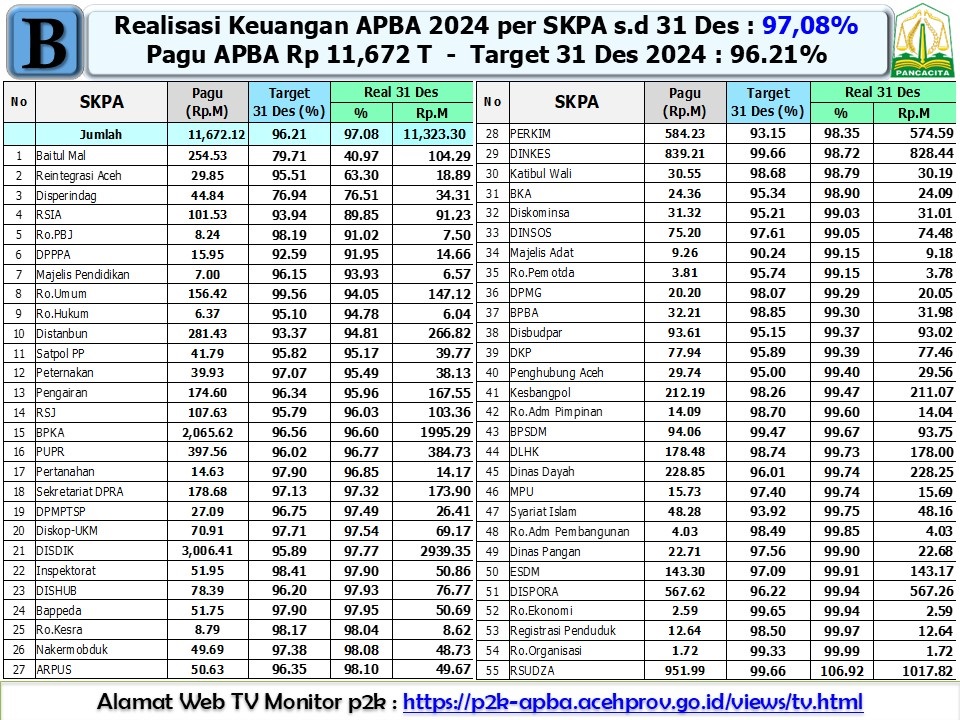 Dilihat Line1.News pada aplikasi Percepatan dan Pengendalian Kegiatan Anggaran Pendapatan dan Belanja Aceh (P2K-APBA), Kamis, 2 Januari 2025, target keuangan APBA 2024 sampai 31 Desember sebesar 96,2% dan realisasinya 97,1% atau melampaui target. Sedangkan realisasi fisik 99,5% dari target 100%.