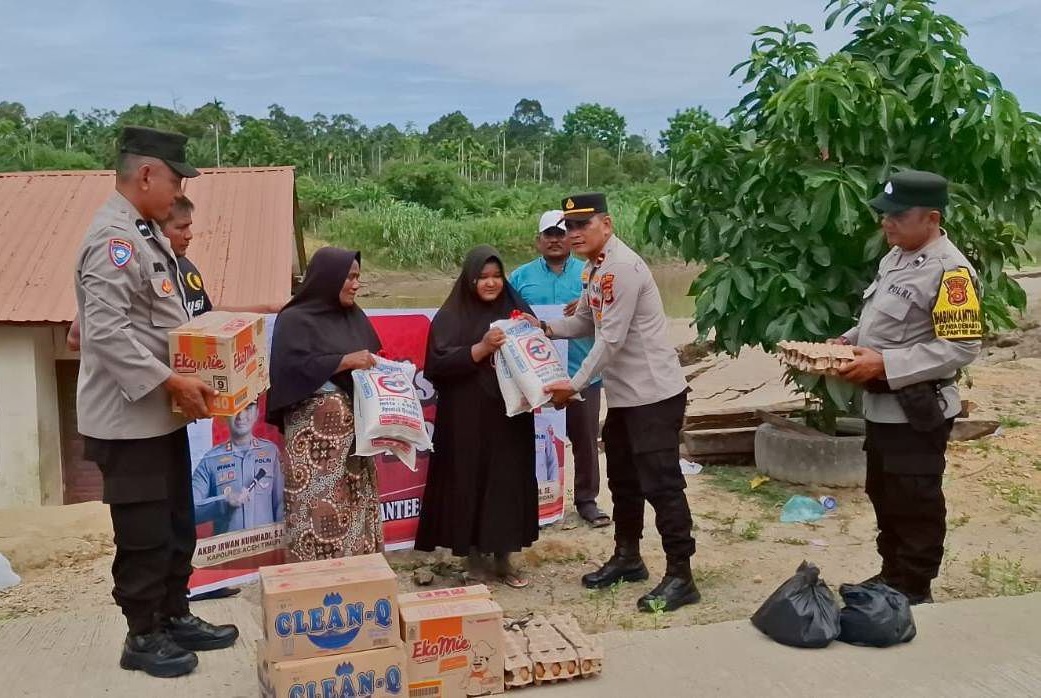 [Kapolsek Pante Bidari Ipda Saiful Bahri menyerahkan bantuan masa panik untuk korban terdampak tanah longsor di Dusun Teladan, Gampong Seuneubok Saboh, Selasa, 10 Juni 2025. Foto: Istimewa]