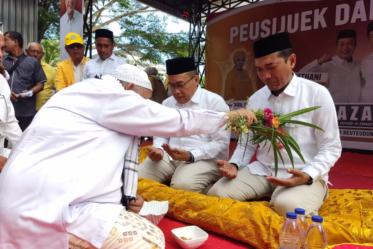 Ulama kharismatik Aceh, Abu Paya Pasi melakukan peusijuek pasangan calon Wali Kota dan Wakil Wali Kota Lhokseumawe, Fathani-Zarkasyi, yang akan mendaftar ke Komisi Independen Pemilihan (KIP), hari ini, Kamis, 29 Agustus 2024.