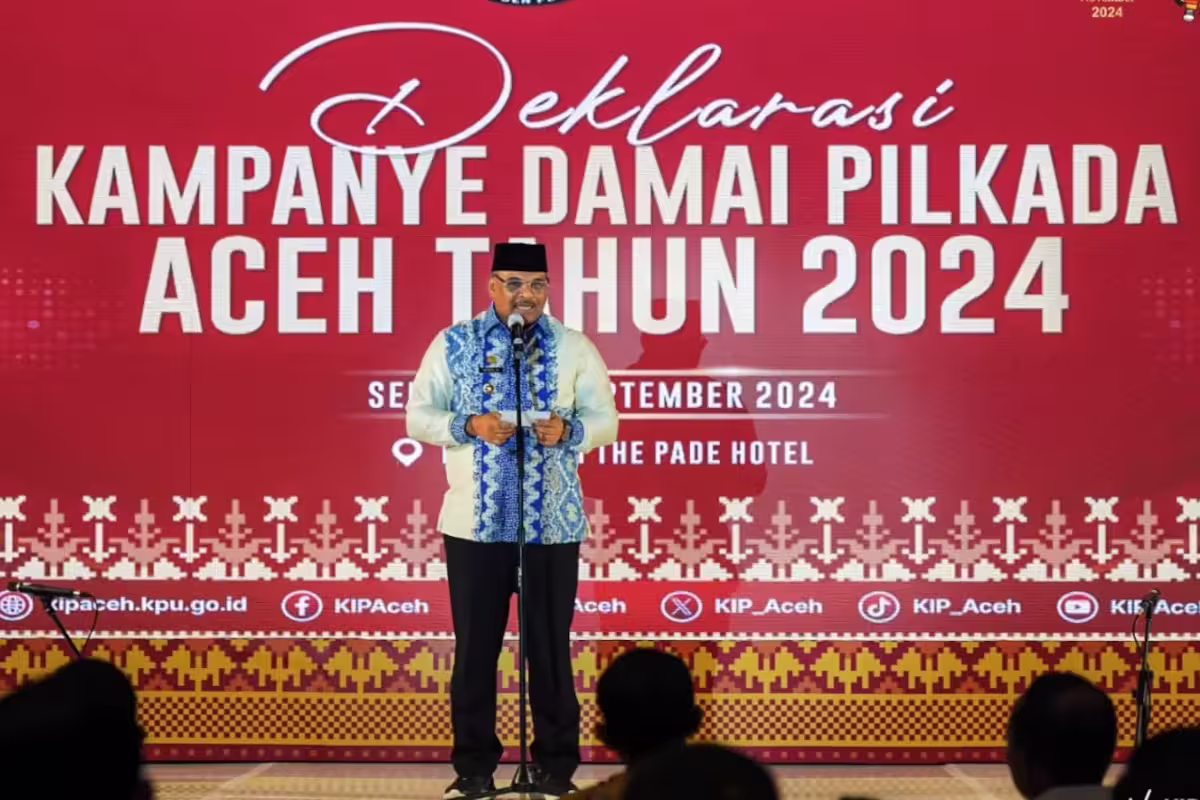 Pj Gubernur Aceh Safrizal ZA menyampaikan sambutan saat Deklarasi Kampanye Damai Pilkada di Ballroom The Pade Hotel, Aceh Besar pada Selasa malam, 24 September 2024. Foto: Humas KIP Aceh