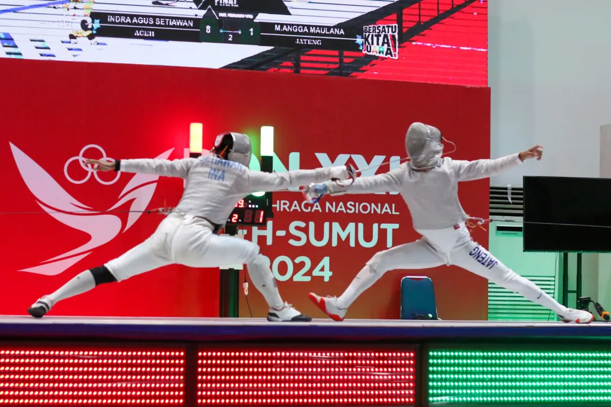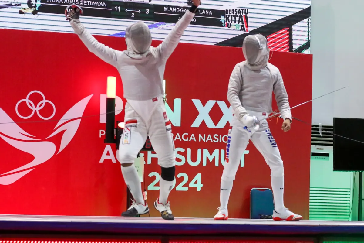 Atlet Anggar Aceh Indra Agus Setiawan mengalahkan Atlet Anggar Jawa Tengah Muhammad Angga Maulana dalam final sabel perorangan putra PON XXI Aceh-Sumut 2024 di Hall Anggar, Stadion Harapan Bangsa, Banda Aceh, Rabu, 11 September 2024. Indra Agus Setiawan berhasil meraih medali emas usai menang atas Muhammad Angga Maulana dengan skor 15-6. Foto-foto: Line1.News/Yasir