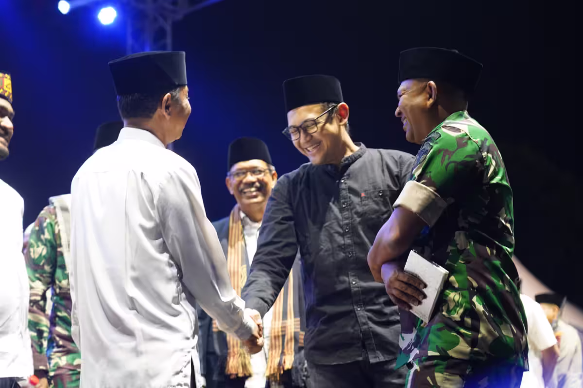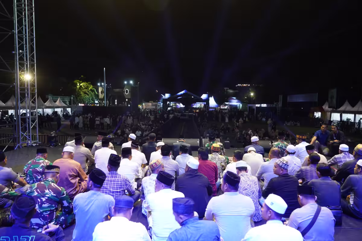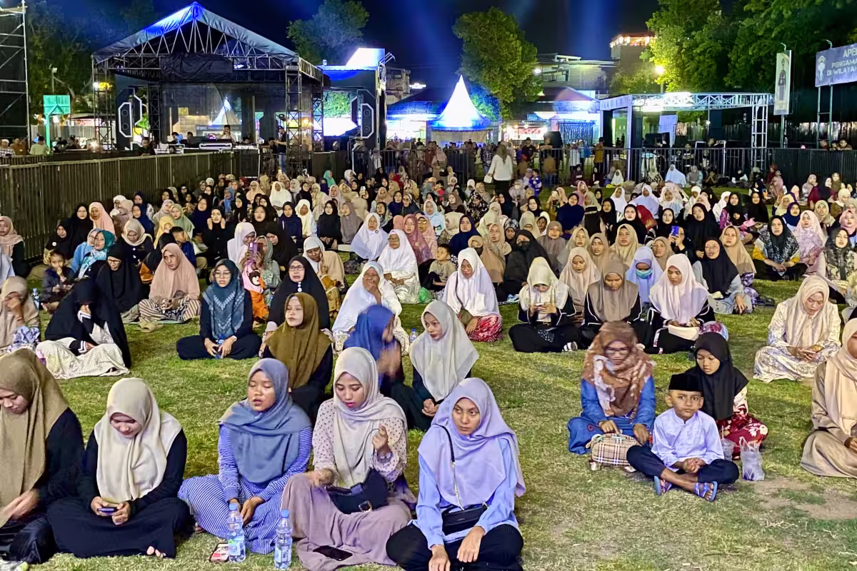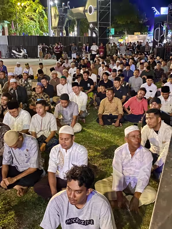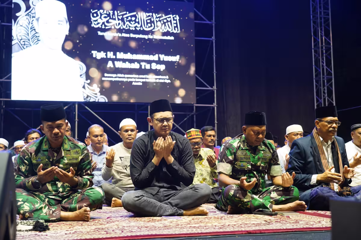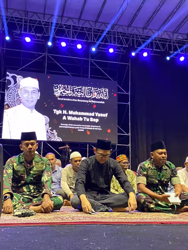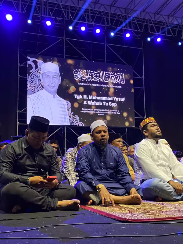 Musisi Bondan Prakoso dan warga Lhokseumawe larut dalam tahlilan untuk almarhum Teungku Muhammad Yusuf A. Wahab akrab disapa Tu Sop, di Lapangan Jenderal Sudirman, Lhokseumawe, Sabtu, 7 September 2024, malam.