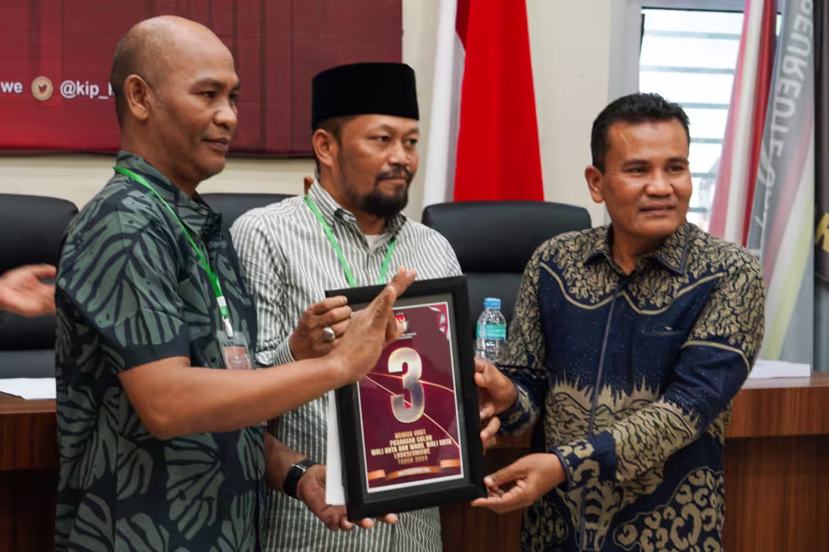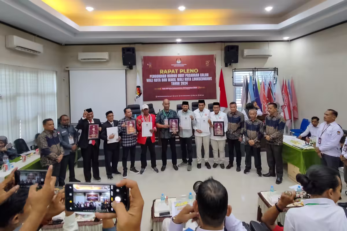 Lhokseumawe – Ketua Komisi Independen Pemilihan (KIP) Lhokseumawe Abdul Hakim menyerahkan plakat nomor urut pasangan calon (paslon) wali kota dan wakil wali kota, Senin, 23 September 2024. Nomor urut itu diundi lalu ditetapkan dalam rapat pleno terbuka di aula KIP Lhokseumawe.