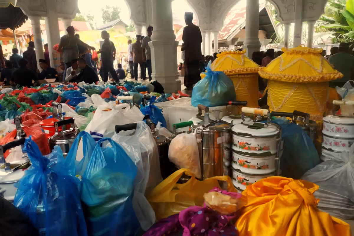 Banyak warga Ujong Tunong membawa kenduri ke musala untuk dibagikan kepada masyarakat dari desa tetangga. Sebagian warga membawa kenduri berupa nasi bu kulah dan menu daging sapi, daging ayam, ikan, dan telor dibungkus kantong plastik. Sebagian lainnya membawa kenduri dalam rantang dan dalong.