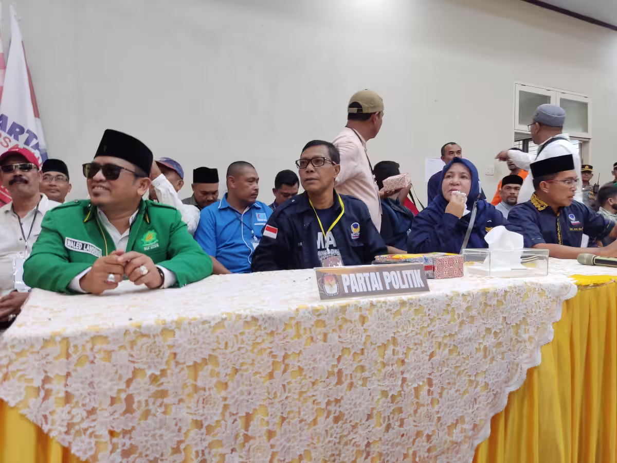 Tampak anggota DPRA terpilih dari PAS Aceh Tgk. Zulfadli (Waled Landeng) dan mantan Pj. Wali Kota Lhokseumawe Rachmatsyah ikut mendampingi IMAM mendaftar sebagai paslon wali kota-wakil wali kota Lhokseumawe periode 2025-2030. IMAM menyerahkan dokumen pendaftaran kepada Ketua KIP Lhokseumawe Abdul Hakim didampingi para komisioner KIP. Foto-foto: Yasir/Line1.News