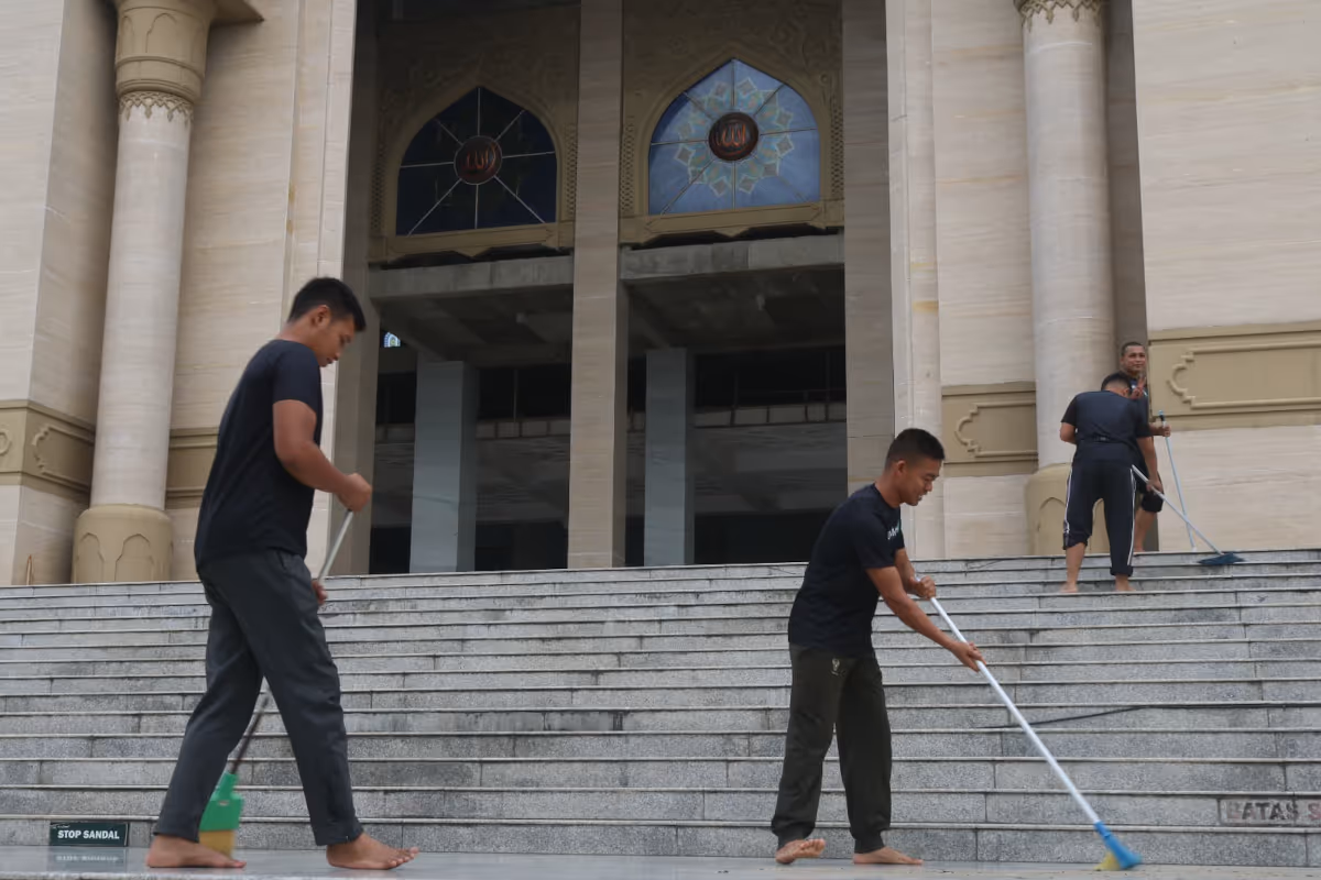 Lhokseumawe – Ratusan prajurit TNI bergotong royong membersihkan halaman dan bagian dalam Masjid Agung Islamic Center, di Desa Simpang Empat, Kecamatan Banda Sakti, Lhokseumawe, Selasa, 3 Juni 2025.