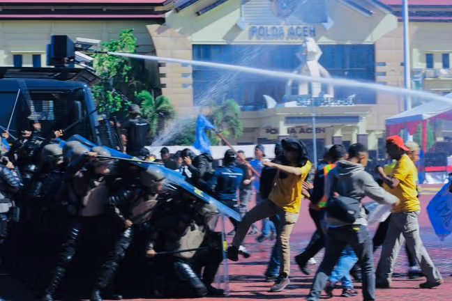 Banda Aceh – Polda Aceh menggelar simulasi sispamkota atau sistem pengaman kota di Lapangan Mapolda Aceh yang disaksikan langsung Kapolda Aceh Irjen Pol Achmad Kartiko, Selasa, 29 April 2025.