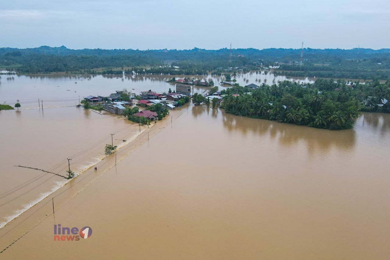 Aceh Utara – Foto udara yang diambil pada Kamis, 27 November 2025, memperlihatkan kondisi permukiman penduduk di Gampong Krueng Seunong dan Keude Krueng, Kecamatan Kuta Makmur, Kabupaten Aceh Utara, yang sebelumnya terisolir akibat banjir.