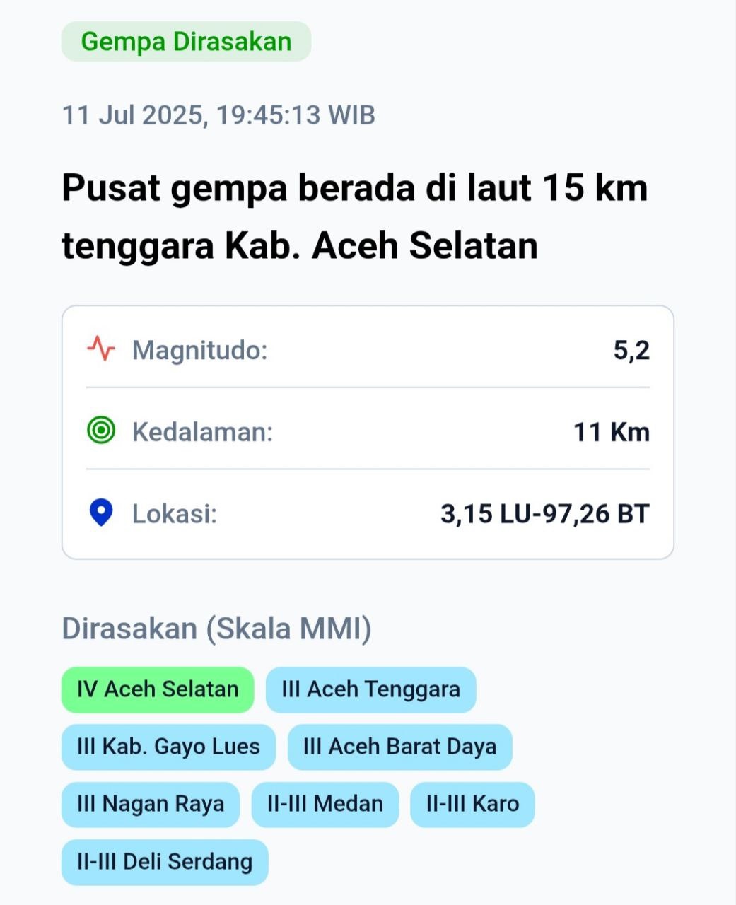 Banda Aceh – Gempa bumi berkekuatan Magnitudo 5,2 mengguncang Aceh Selatan, Jumat, 11 Juli 2025, sekitar pukul 19.45 waktu Aceh atau selesai salat Magrib. Gempa tersebut tidak berpotensi tsunami.