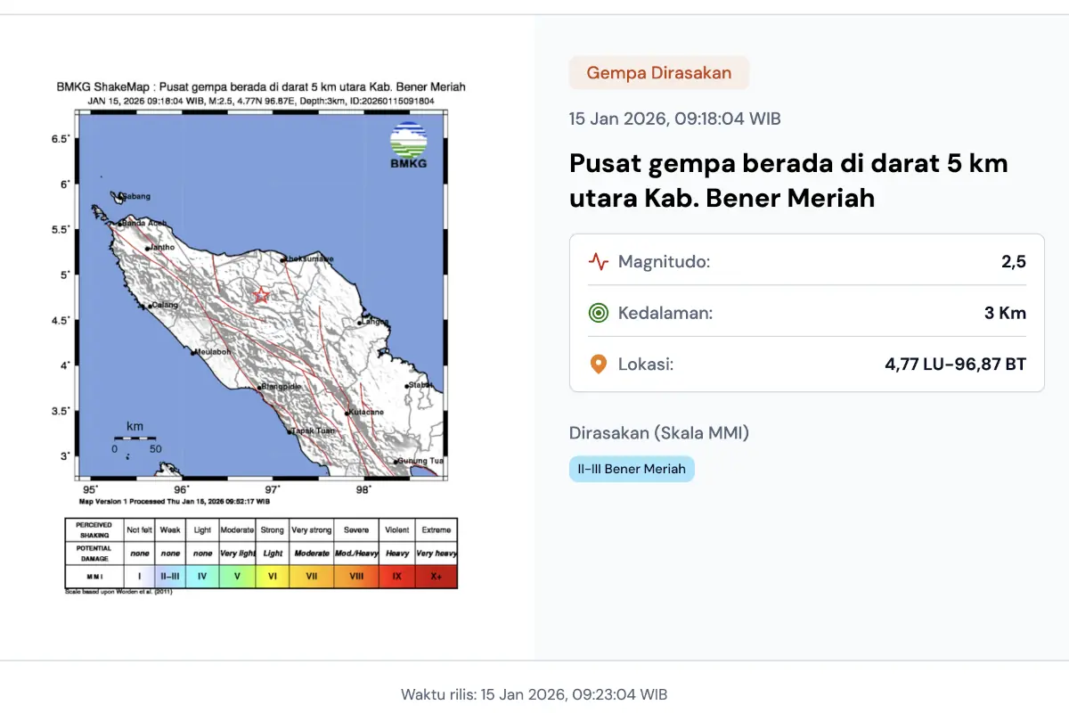 Redelong – Gempa bumi berkekuatan Magnitudo 2,5 mengguncang Bener Meriah pada Kamis pagi, 15 Januari 2026. Gempa terjadi pukul 09.18 waktu Aceh dengan pusat di darat yakni lima kilometer utara Bener Meriah.