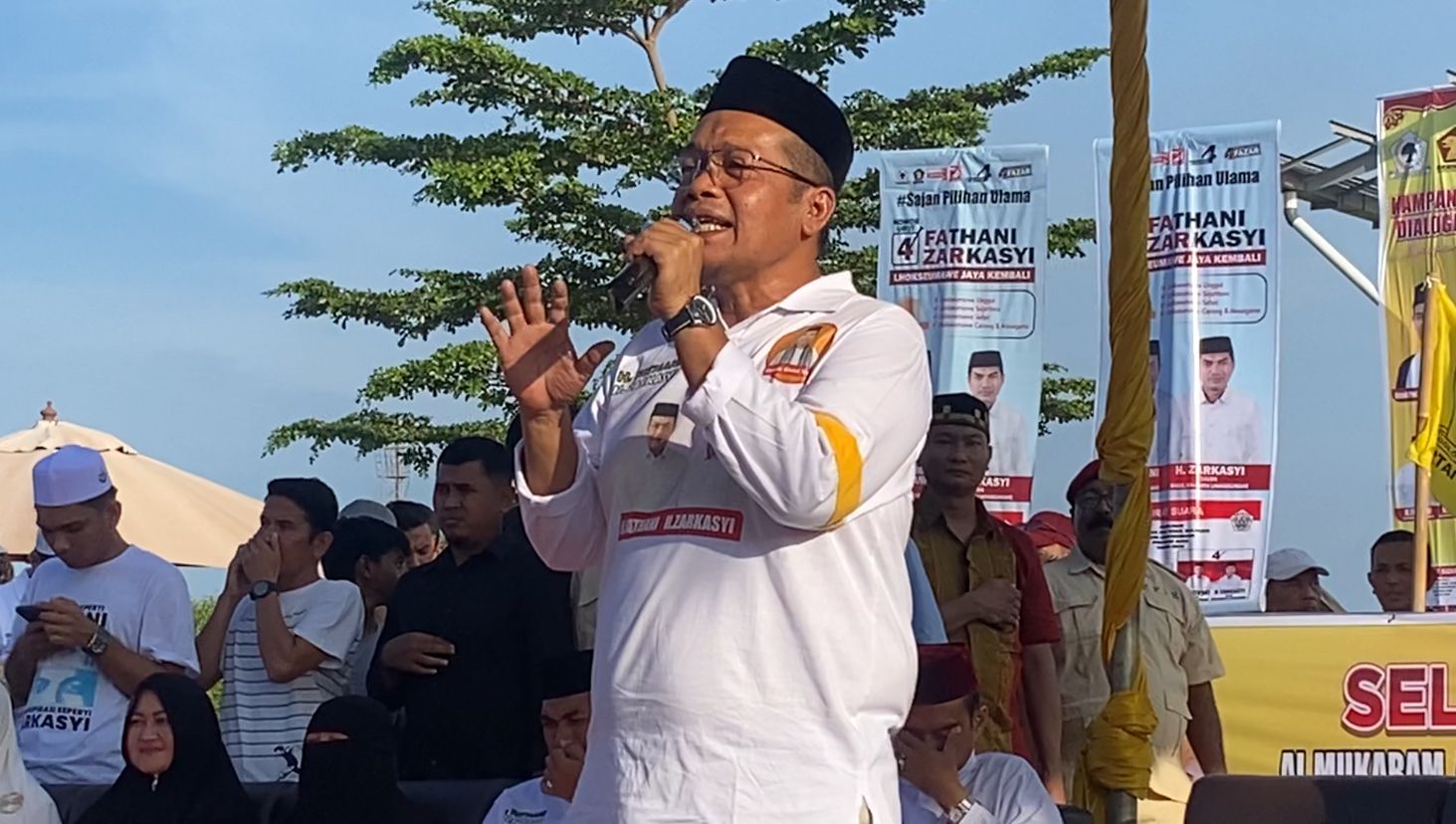 Turut hadir calon wakil gubernur Aceh Fadhlullah atau Dek Fad yang datang ke Lhokseumawe bersama UAS setelah mengikuti kampanye akbar pasangan calon wali kota dan wakil wali kota Subulussalam H. Rasyid Bancin dan Nasir Kombih di Lapangan Sada Kata, Sabtu (16/11).[]