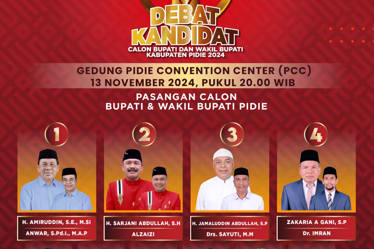Sigli – Komisi Independen Pemilihan (KIP) Pidie menggelar debat kandidat calon bupati-wakil bupati pada Rabu malam, 13 November 2024, di Gedung Pidie Convention Center (PCC), Jalan Lingkar Blangpaseh, Sigli, mulai pukul 20.00 waktu Aceh. Debat kandidat diikuti empat pasangan calon (paslon) bupati-wakil bupati yakni Amiruddin-Anwar, Sarjani Abdullah-Al Zaizi, Jamaluddin Abdullah-Sayuti, dan Zakaria A Gani-Imran.