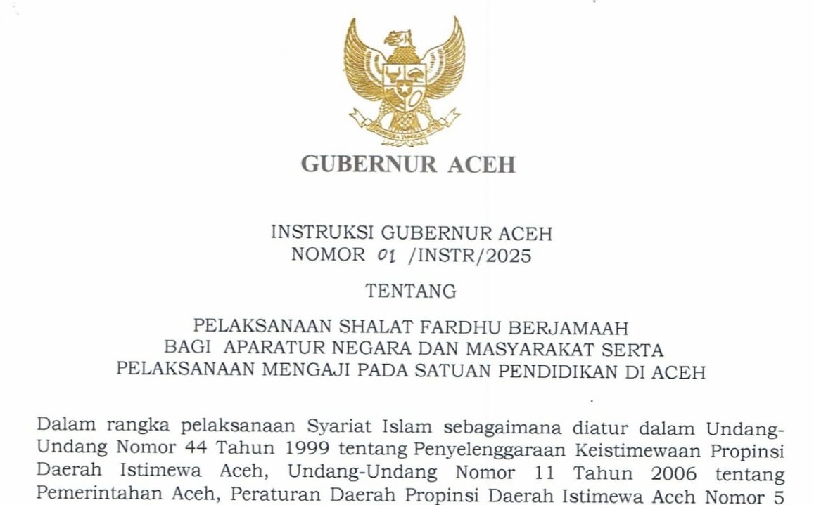 Instruksi tersebut ditetapkan di Banda Aceh pada 14 Maret 2025 dan diteken langsung oleh Gubernur Aceh Muzakir Manaf. Instruksi Gubernur ini mulai berlaku pada tanggal ditetapkan.