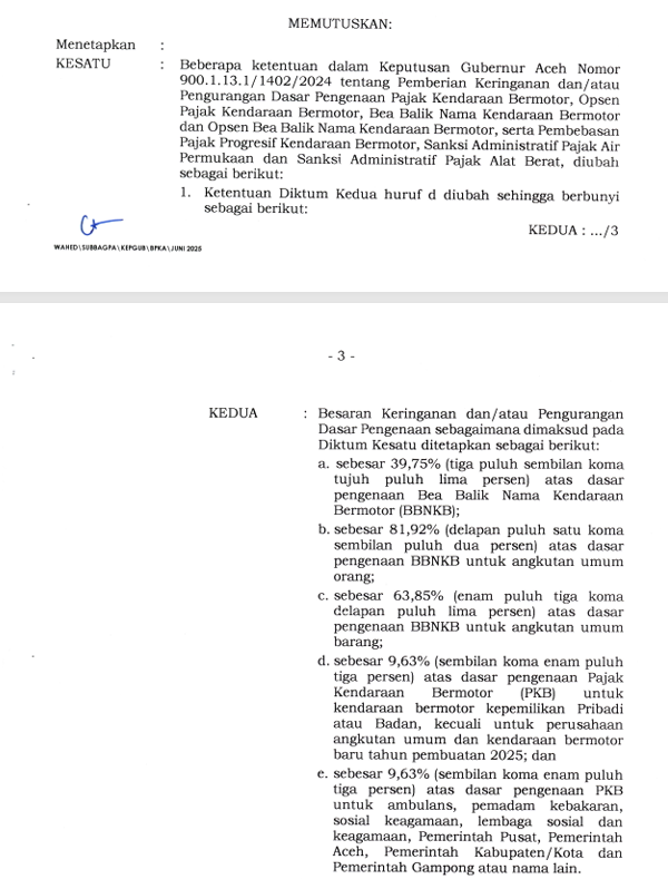 Banda Aceh – Gubernur Aceh, Muzakir Manaf atau Mualem, resmi memperpanjang Keputusan Gubernur (Kepgub) tentang Pemberian Keringanan dan/atau Pengurangan Dasar Pengenaan Pajak Kendaraan Bermotor (PKB), Opsen PKB, Bea Balik Nama Kendaraan Bermotor (BBNKB), dan Opsen BBNKB, serta Pembebasan Pajak Progresif Kendaraan Bermotor, Sanksi Administratif Pajak Air Permukaan dan Sanksi Administratif Pajak Alat Berat.