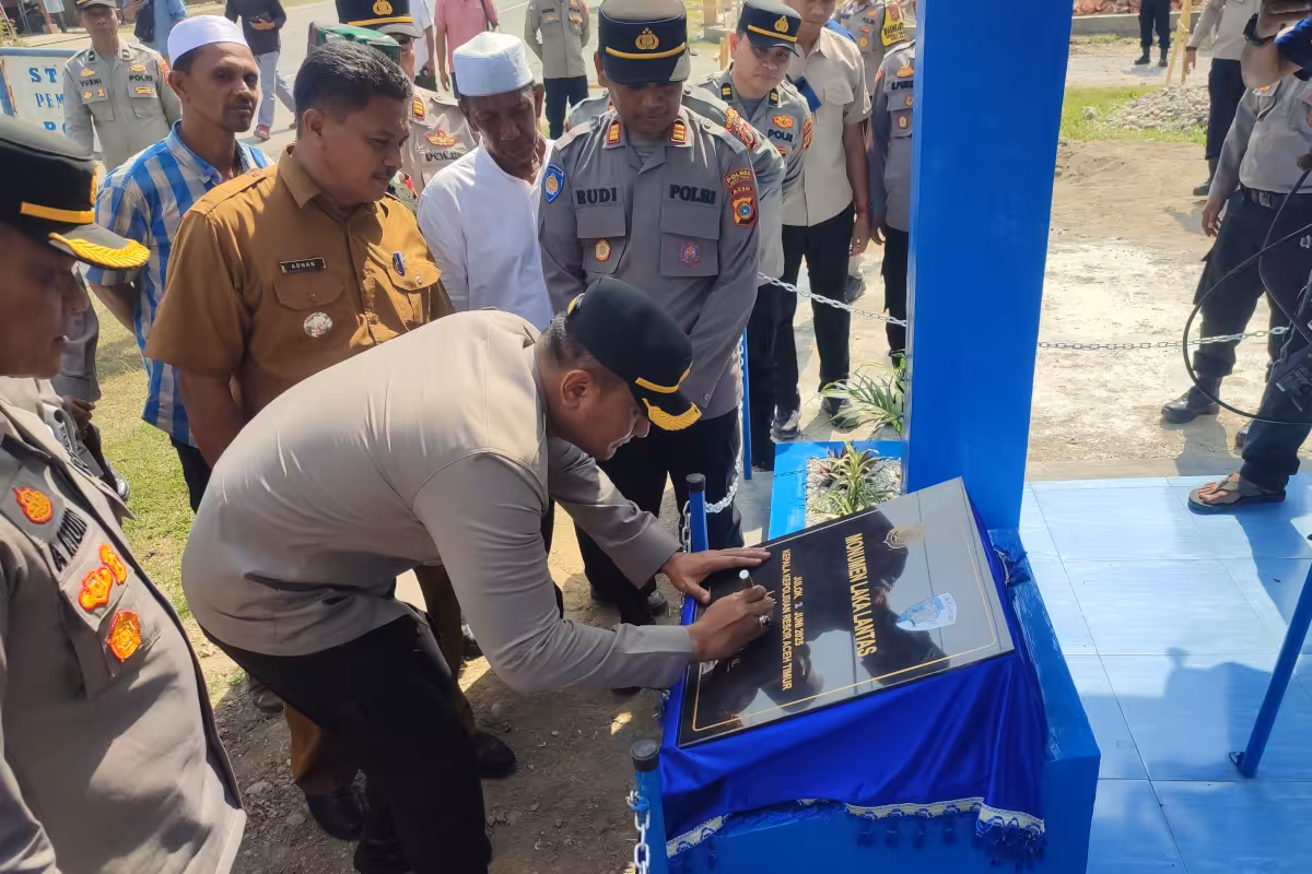 Kapolres Aceh Timur Irwan Kurniadi menandatangani prasasti monumen laka lantas. Foto: Hasan Basri