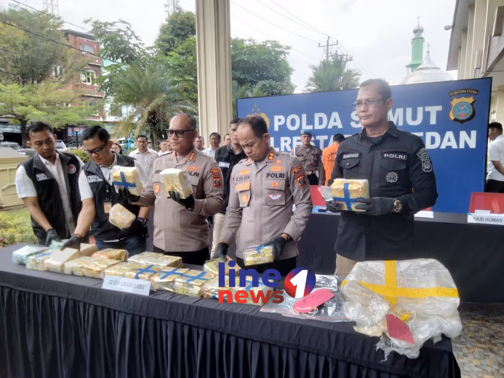 Kapolrestabes Medan memaparkan keberhasilan anggota Satuan Reserse Narkoba Polrestabes Medan mengungkap 22 kilogram sabu dikendalikan oleh kurir sabu jaringan Malaysia, Selasa (13/5/2025). Foto: Line1.News/Chairunnas