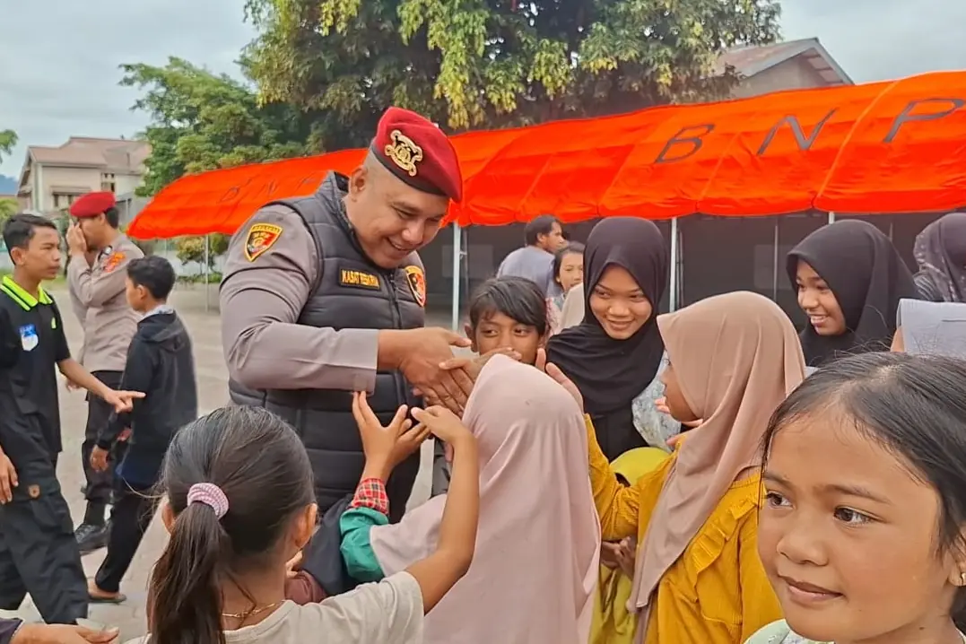 Kasat Reskrim Iptu Deno Wahyudi menyerahkan langsung bantuan dan didampingi personelnya. Kehadiran rombongan disambut hangat para pengungsi, terutama anak-anak yang tampak ceria dan antusias menyambut kedatangan petugas.
