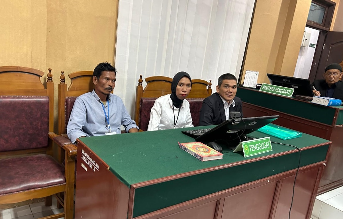 Ramli Robi (kiri) didampingi dua penasihat hukumnya, Mahmud dan Zaidah Sari saat sidang pertama perkara permohonan ganti kerugian di Pengadilan Negeri Lhokseumawe, Senin, 3 Februari 2025. Foto for Line1News